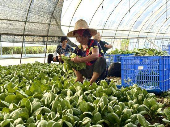 初秋时节,南昌幽美农业发展有限公司蔬菜种植基地内,一栋栋标准化种植大棚整齐矗立,红苋菜、空心菜、油麦菜等蔬菜长势正好,前来务工的村民穿梭在田间,熟练地采摘着成熟的蔬菜。